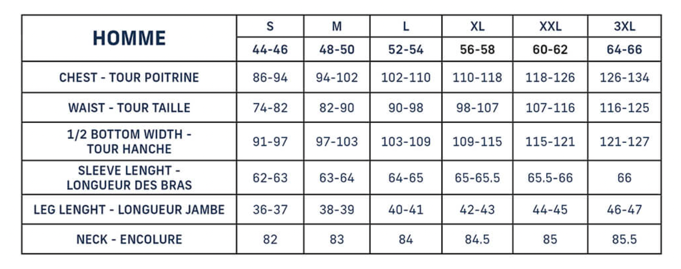 Le guide des tailles est joint avec les photos.