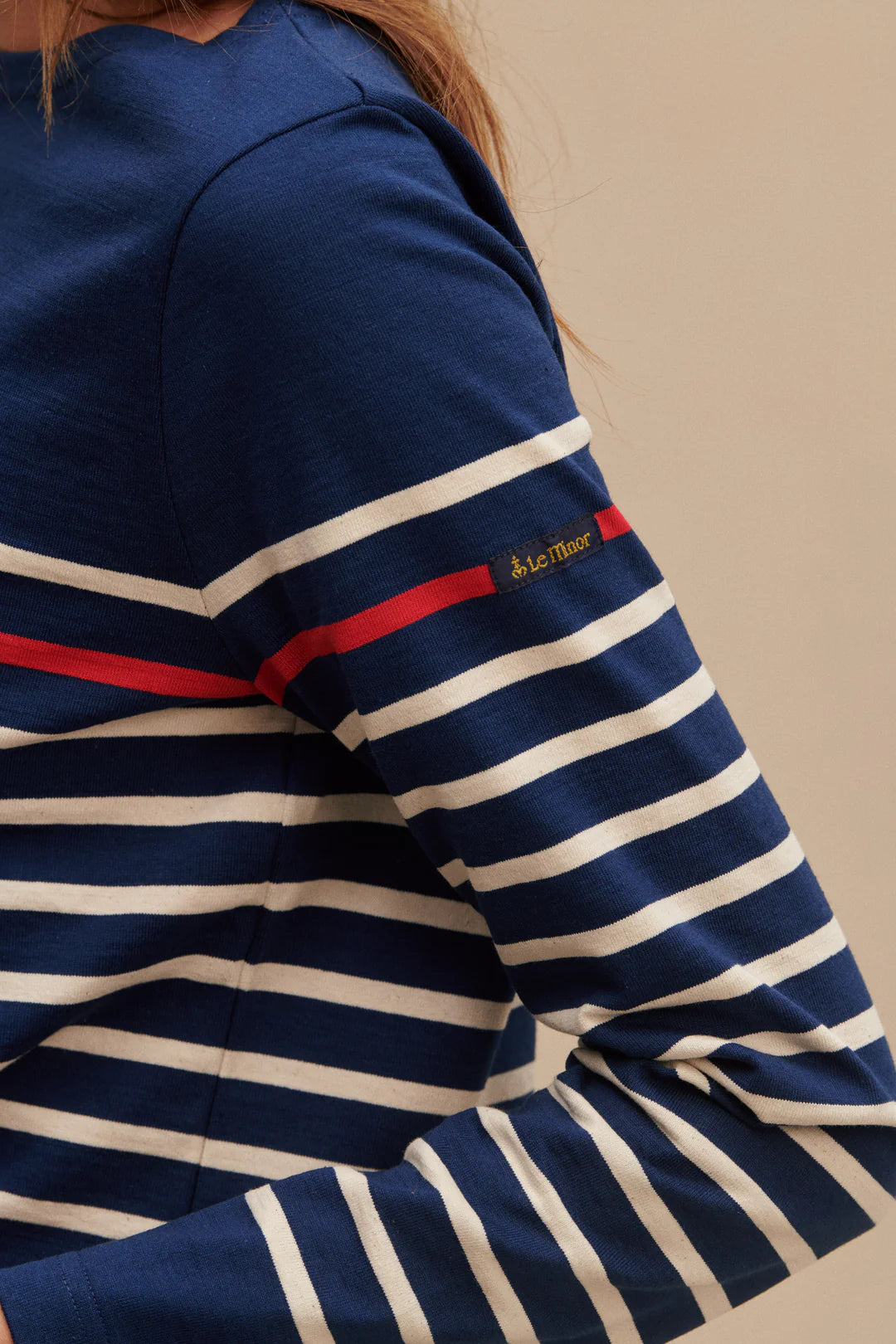 Cette marinière pour femme signée Le Minor revisite le style marin traditionnel avec une composition 100% coton haut de gamme, une base marine profonde et un jeu subtil de rayures blanches relevées d'une rayure rouge nuancée au centre.